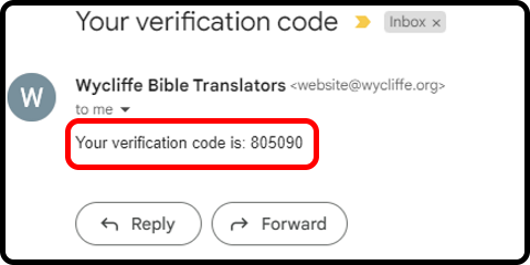 Check your Wycliffe.org email address for an email, titled “Your Verification Code”, and note the verification code within this email.