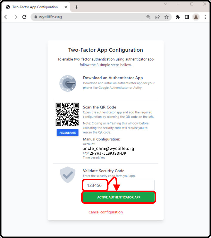 After clicking Yes in the previous screenshot above, you will be presented with a Two-Factor App Configuration screen.