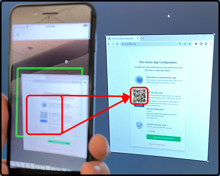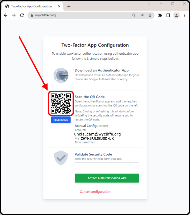 Using your authenticator app, scan the QR code on the screen.