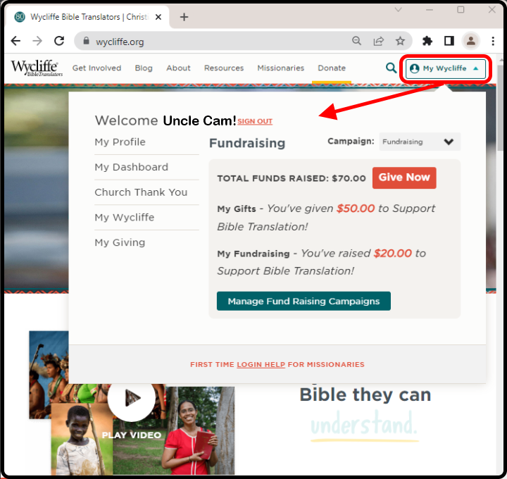 You will be redirected back to the Wycliffe.org website and will be logged in and ready to view your account.